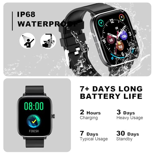 【IP67 Waterproof & Long Last Time】The waterproof smart watch meets the IP67 waterproof standard. You can wear it while washing your hands, running in the rain, Not suitable for swimming, diving and bathing. This sports activity watch is equipped with a 290 mAh large-capacity battery, equipped with a fast charge charger, which can be used for 3-6 days when fully charged, and the standby time is over 30 days. Do not let the watch soak in sea water and hot water, such as hot springs, etc.